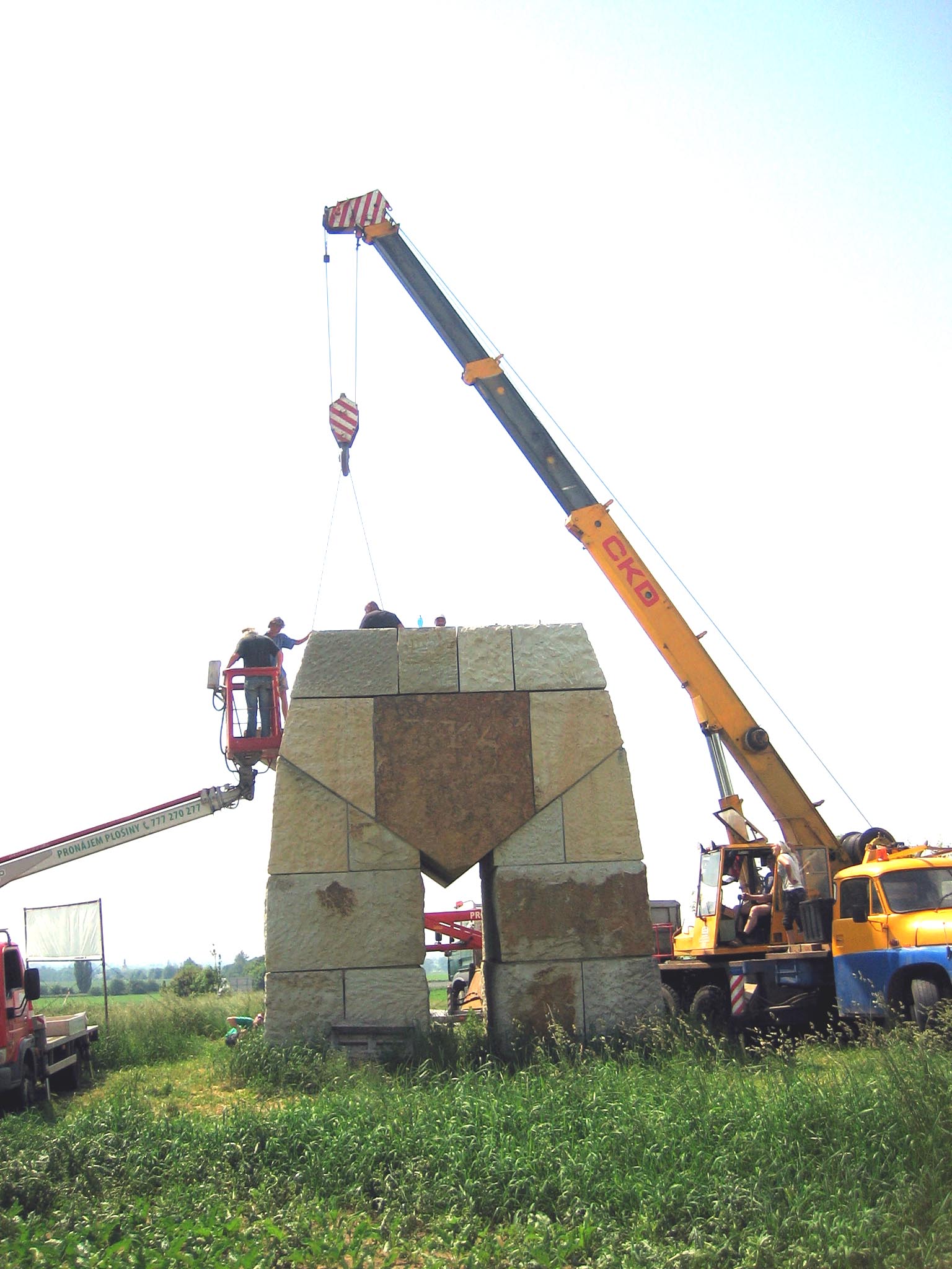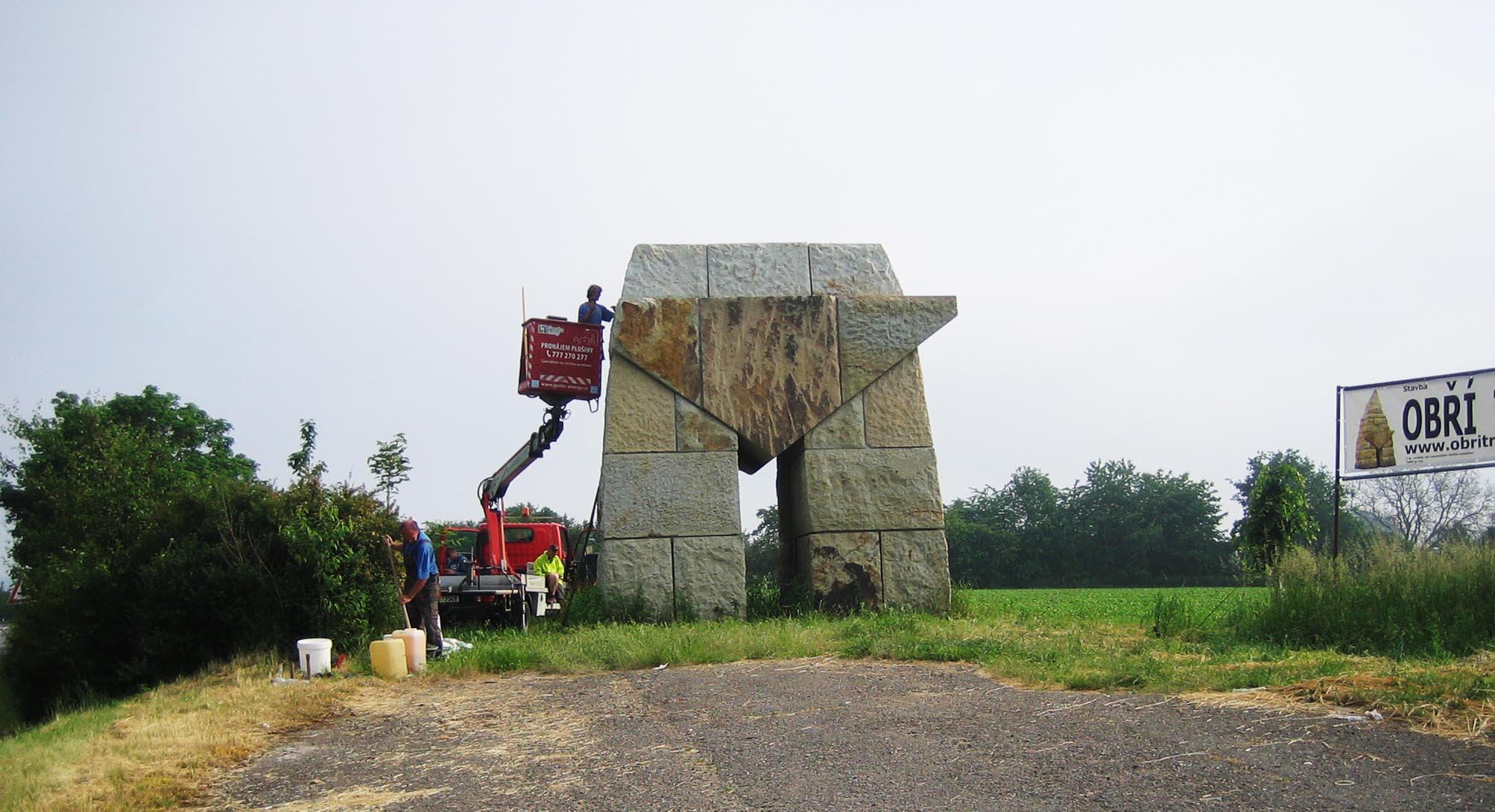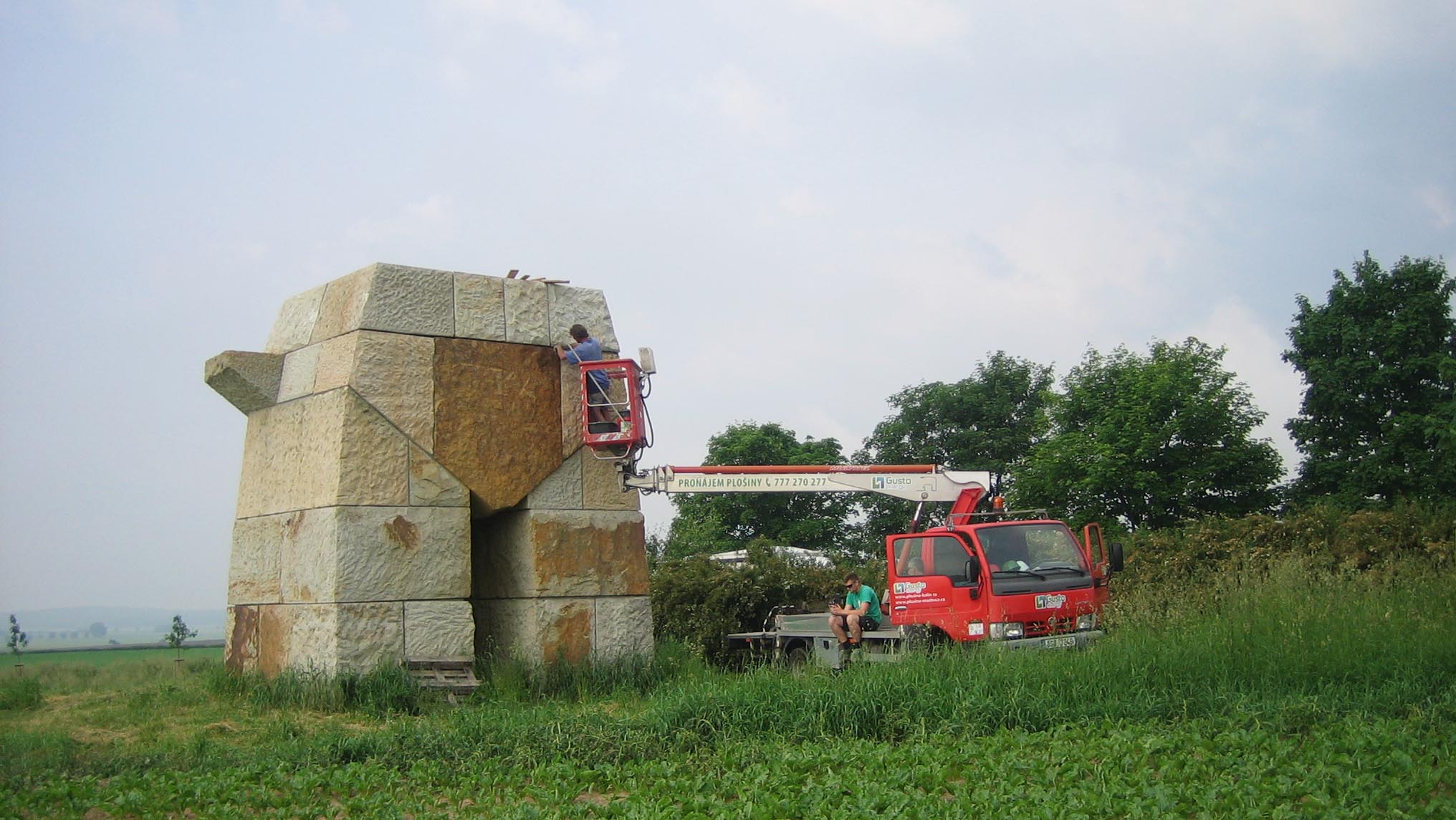 Cestující po silnici I/35 mohli minulý pátek a sobotu zaznamenat kolem stavby Obřího trpaslíka čilý stavební ruch. Pomocí těžké stavební techniky bylo osazeno 7 dalších pískovcových bloků tvořících celou jednu vrstvu trpaslíka a jeho výška se přiblížila šesti metrům. Okrášlovací spolek Rašín plánuje přidat po prázdninách ještě jednu, už předposlední vrstvu. A tak v příštím roce už čekají spolek jednání s dodavatelem čepice Obřího trpaslíka. Ta má tvar nepravidelného jehlanu se základnou 2,5 x 2 m a výšce 4 m. Vylomení pískovcového bloku této velikosti je technický problém a pro Okrášlovací spolek Rašín to znamená sehnat mecenáše na částku v řádu statisíců korun. Věříme, že se to podaří.